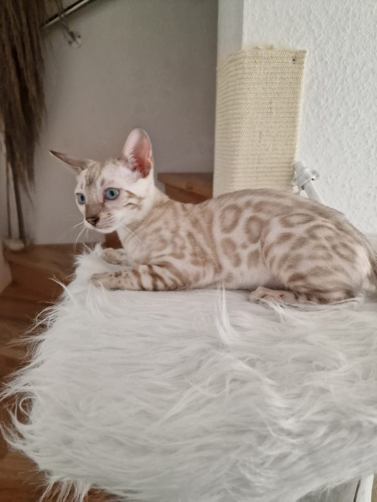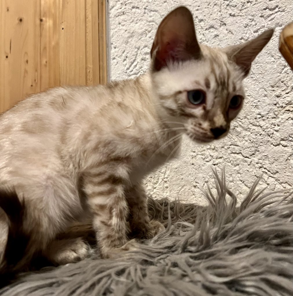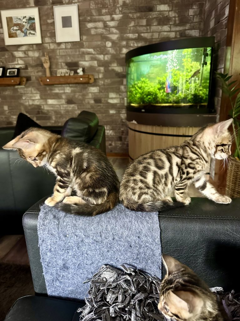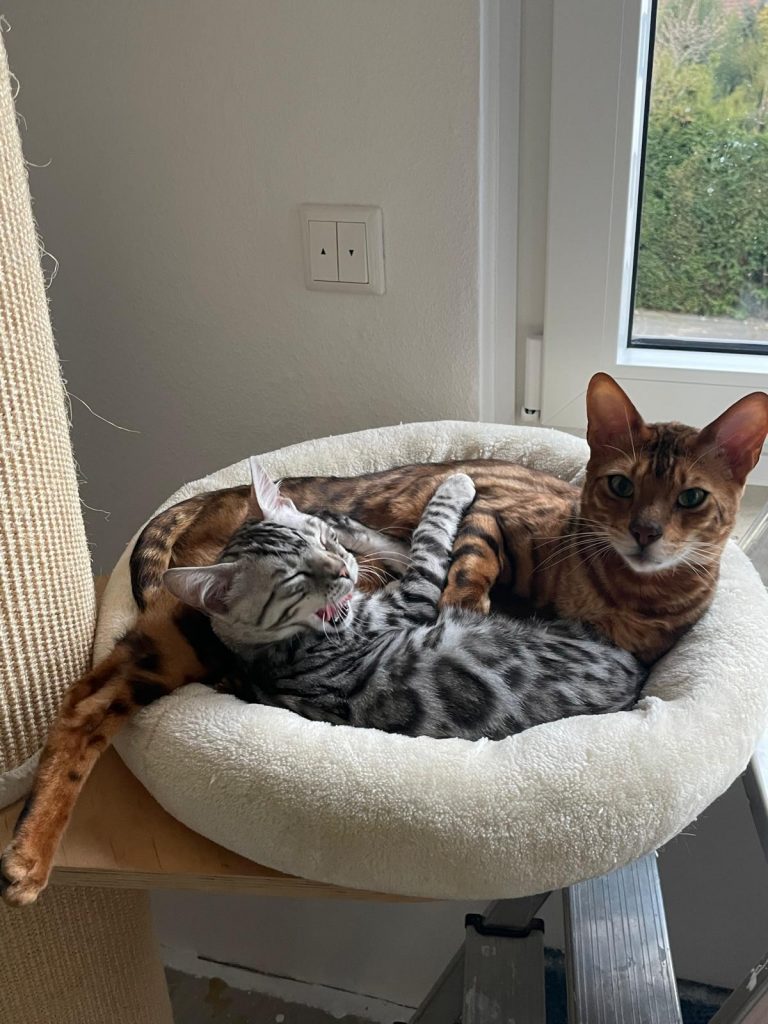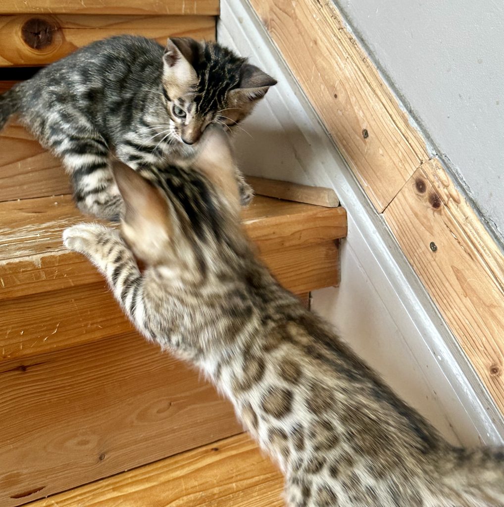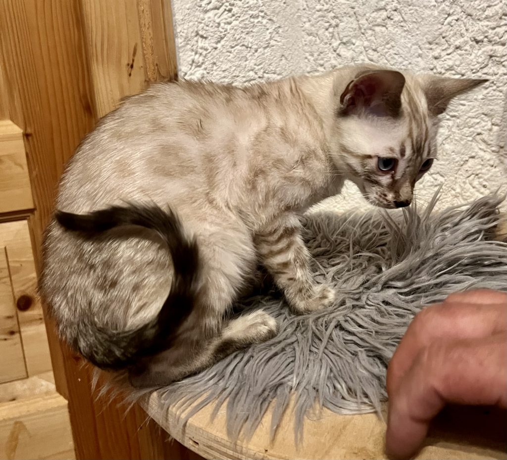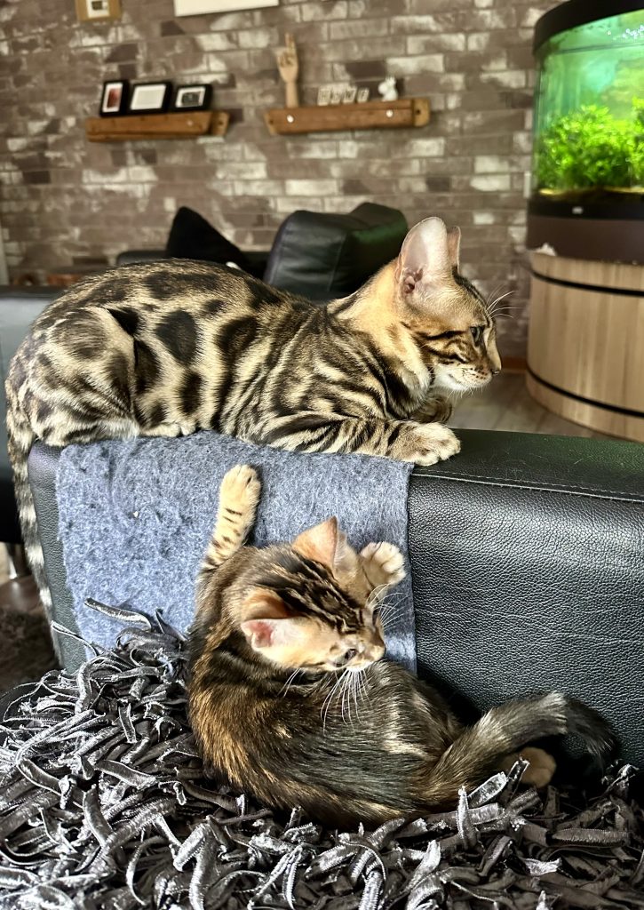 Suri ist eine Brown/Silver tabby spotted-Bengal; der Deckkater Chiko ist Brown/Black spotted tabby. Beide sind nicht nur wunderschön mit seidigem Fell, sondern haben auch einen wunderbaren Charakter. Bei den beiden war es Liebe auf den ersten Blick! Sie sind einfach zauberhaft. Beide Elterntiere hatten bereits erfolgreich Nachwuchs. Alle Kitten sind prächtig schön geworden und vor allem kerngesund!! Wir sind TICA – vereinsangehörig und selbstverständlich bekommen die Kitten Stammbäume.