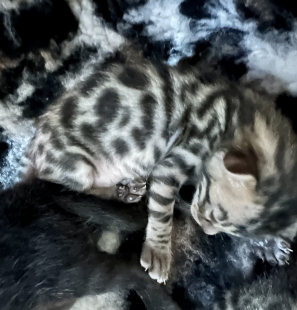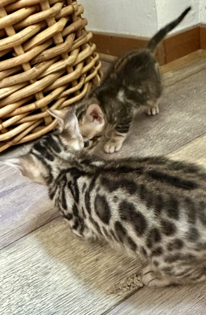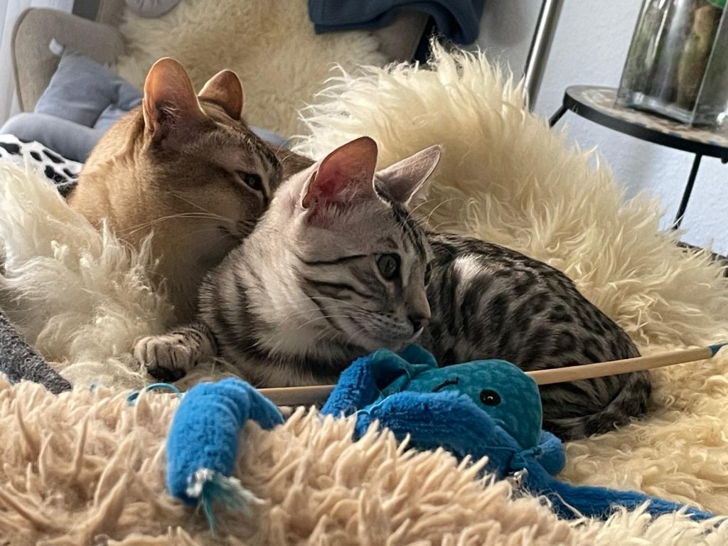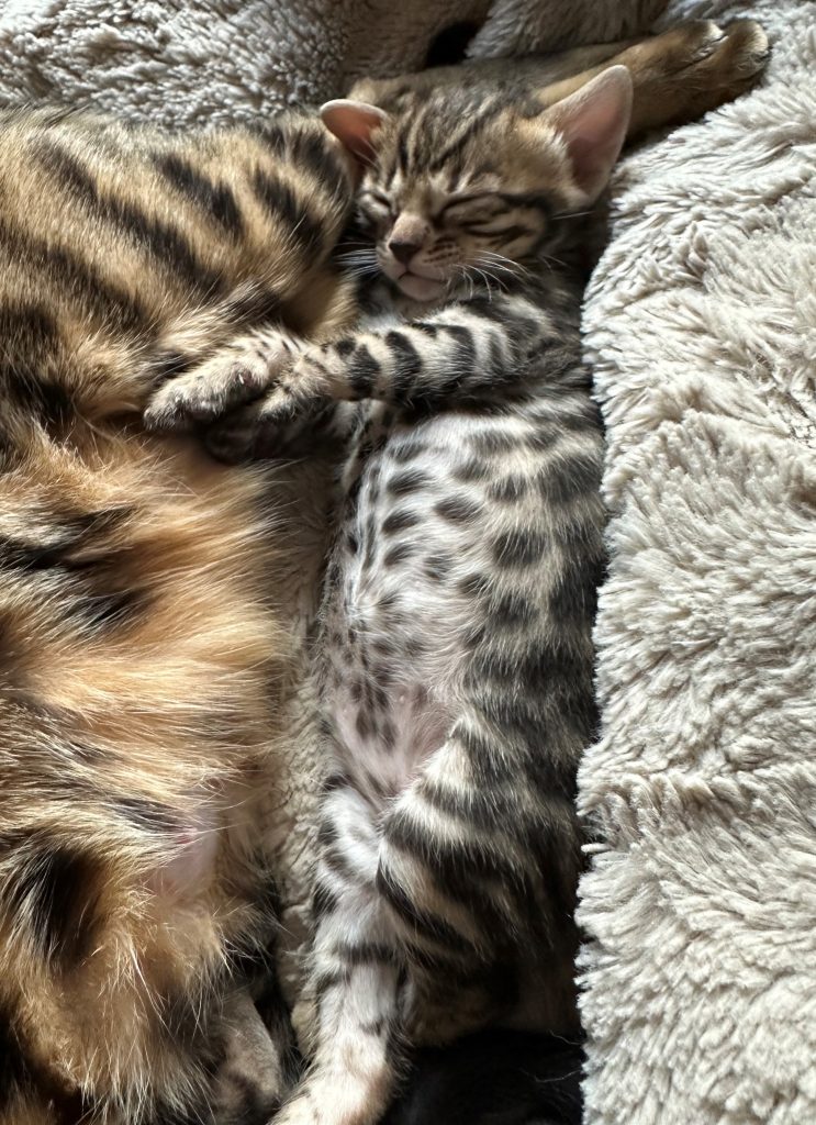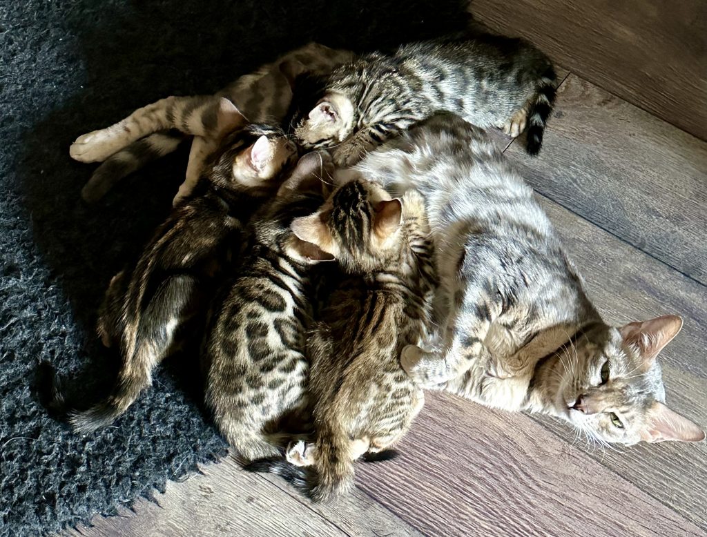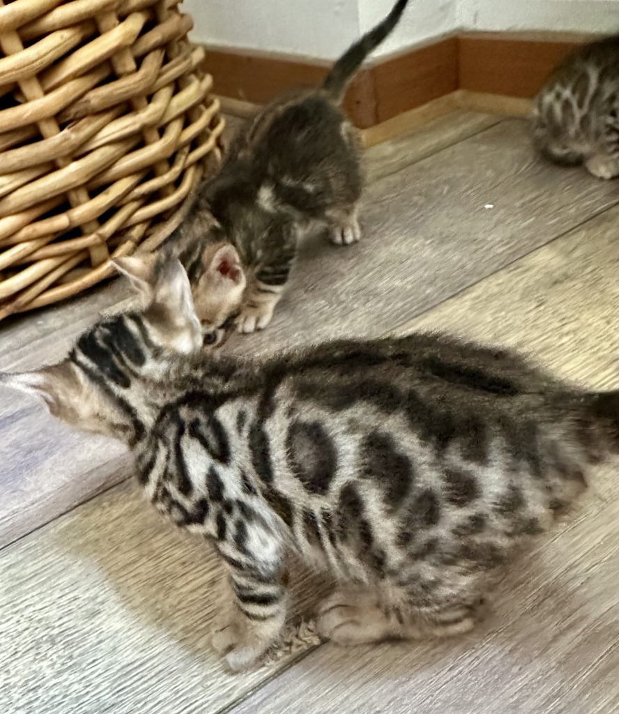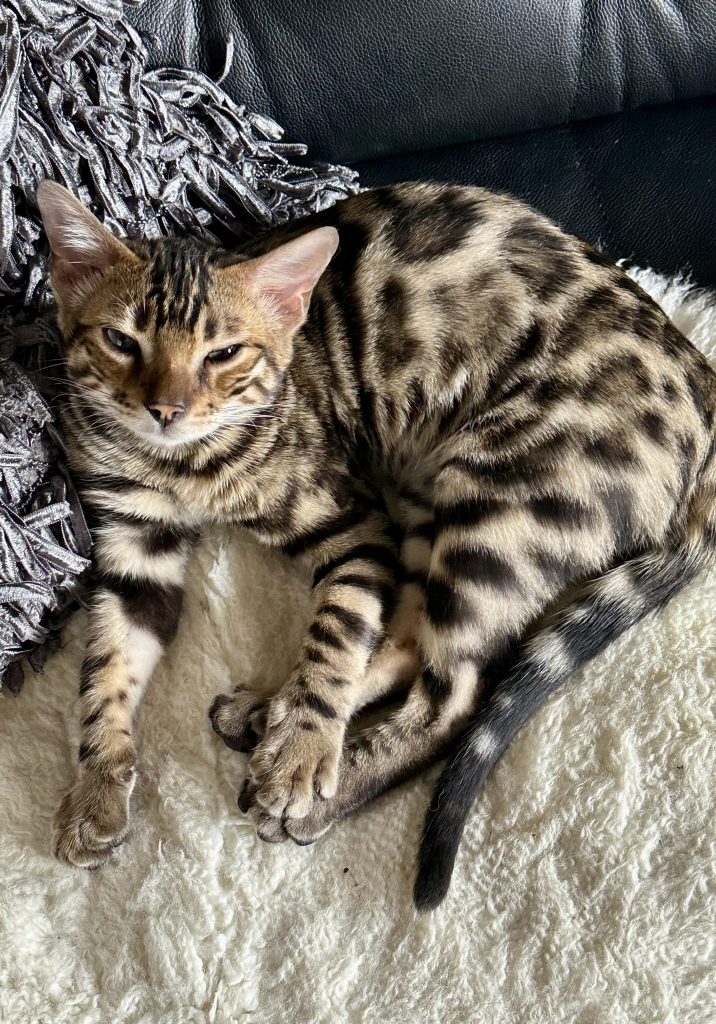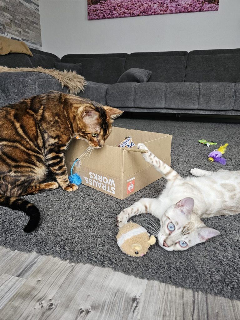 Suri ist eine Brown/Silver tabby spotted-Bengal; der Deckkater Chiko ist Brown/Black spotted tabby. Beide sind nicht nur wunderschön mit seidigem Fell, sondern haben auch einen wunderbaren Charakter. Bei den beiden war es Liebe auf den ersten Blick! Sie sind einfach zauberhaft. Beide Elterntiere hatten bereits erfolgreich Nachwuchs. Alle Kitten sind prächtig schön geworden und vor allem kerngesund!! Wir sind TICA – vereinsangehörig und selbstverständlich bekommen die Kitten Stammbäume.