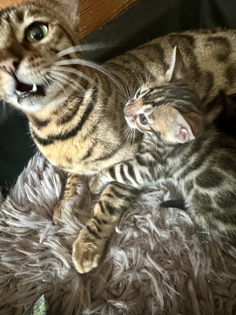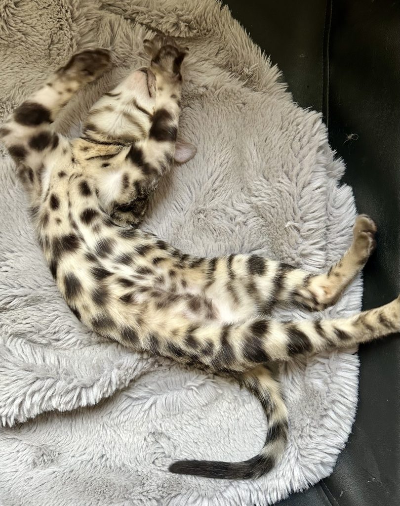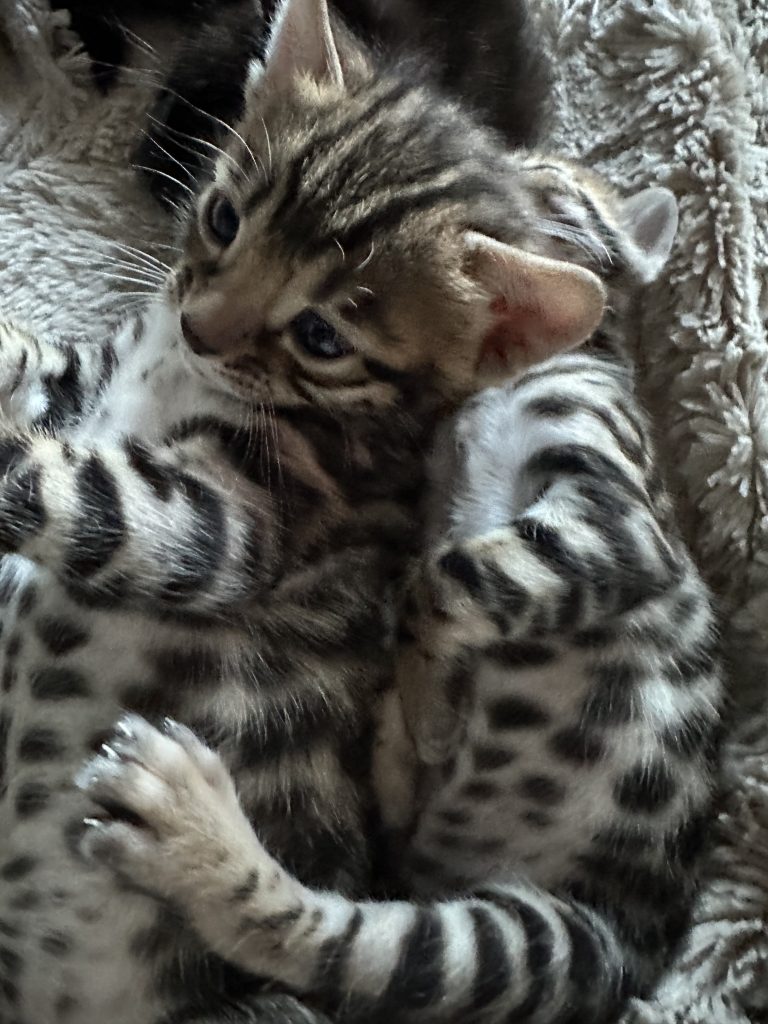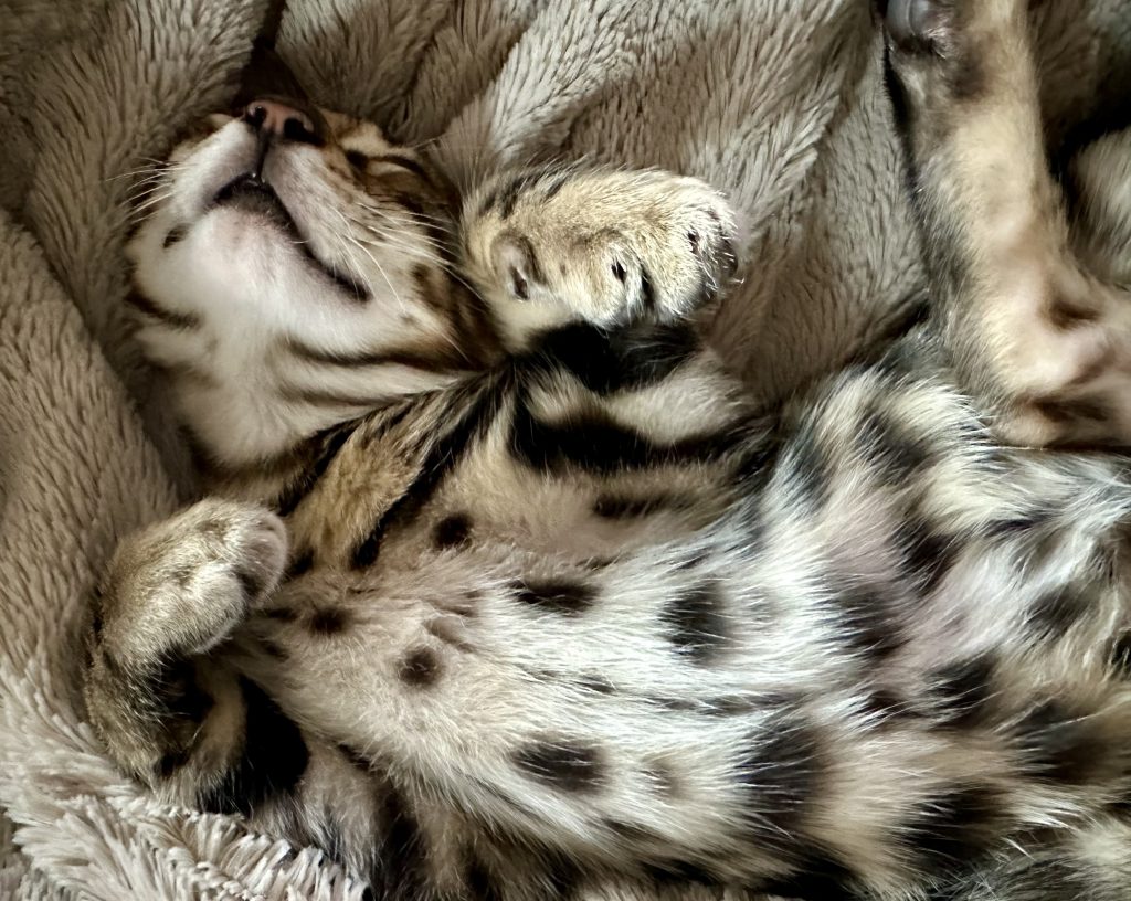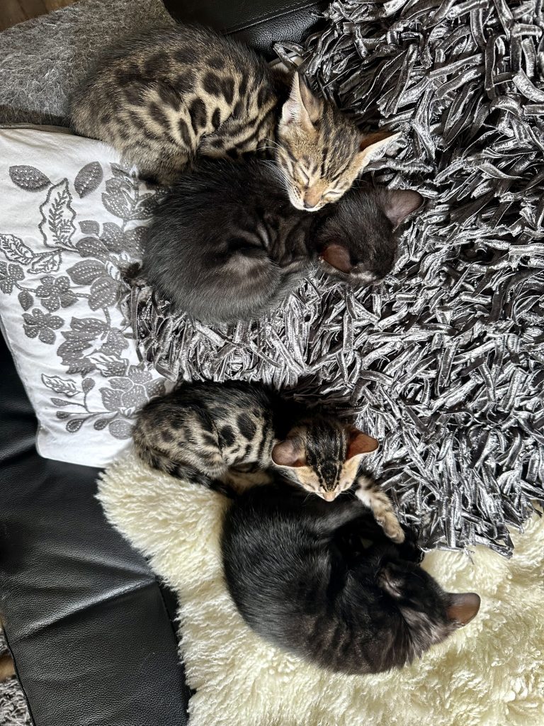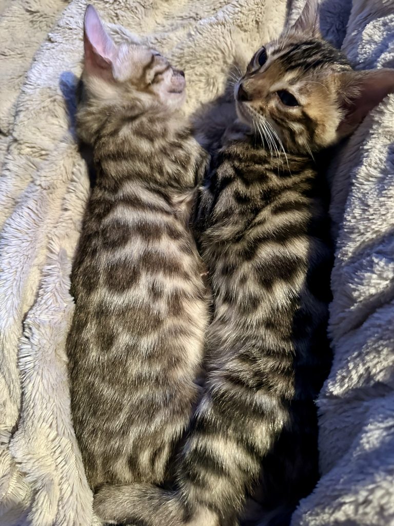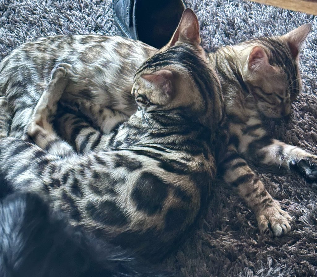 Suri ist eine Brown/Silver tabby spotted-Bengal; der Deckkater Chiko ist Brown/Black spotted tabby. Beide sind nicht nur wunderschön mit seidigem Fell, sondern haben auch einen wunderbaren Charakter. Bei den beiden war es Liebe auf den ersten Blick! Sie sind einfach zauberhaft. Beide Elterntiere hatten bereits erfolgreich Nachwuchs. Alle Kitten sind prächtig schön geworden und vor allem kerngesund!! Wir sind TICA – vereinsangehörig und selbstverständlich bekommen die Kitten Stammbäume.