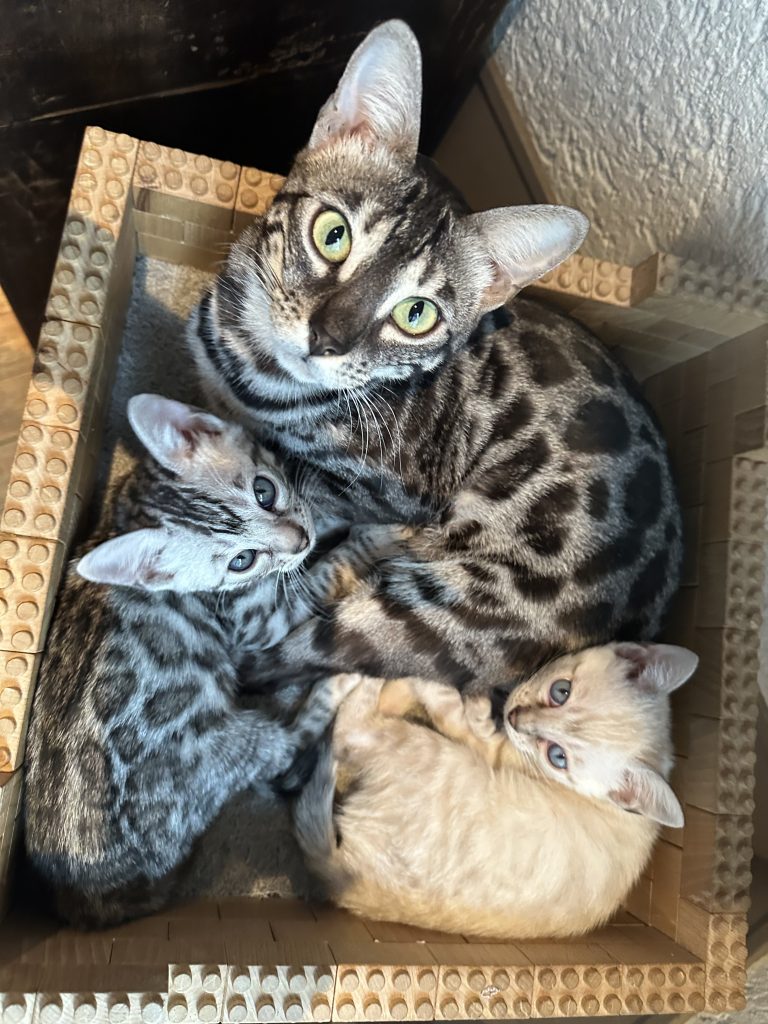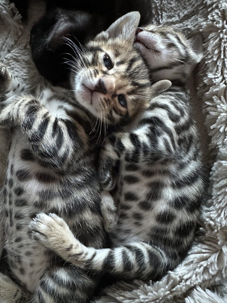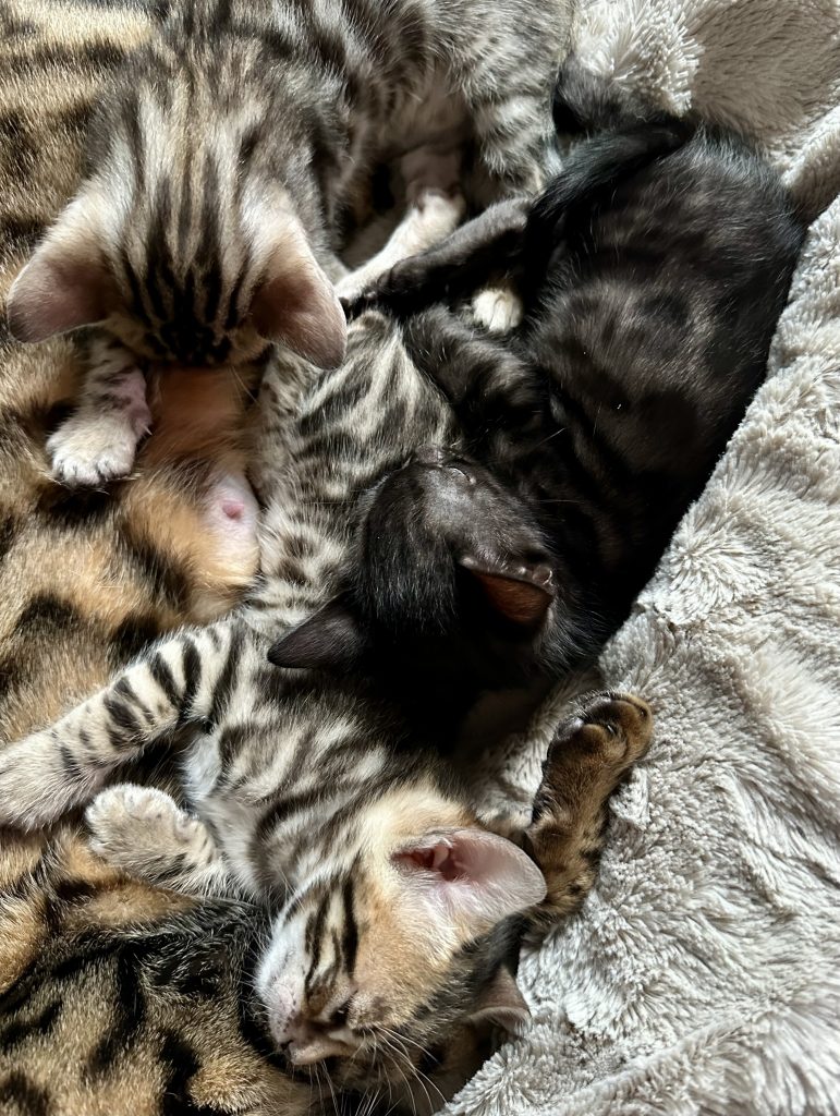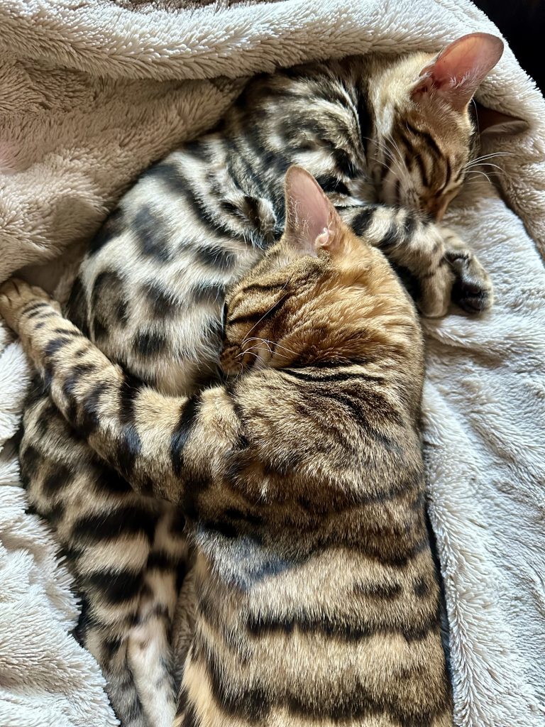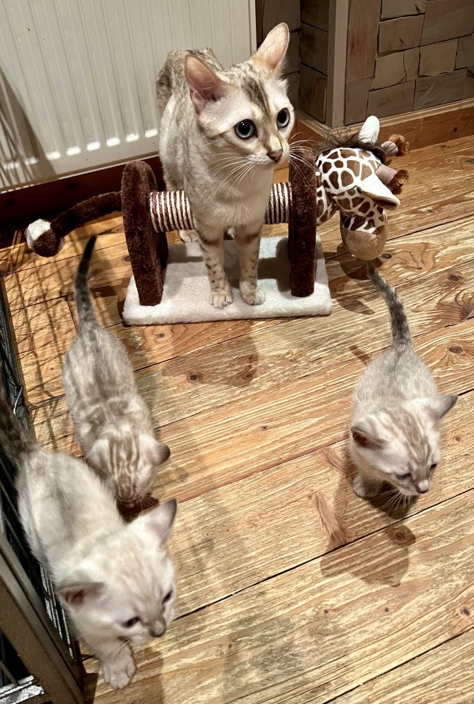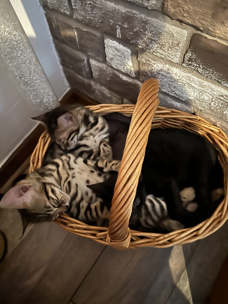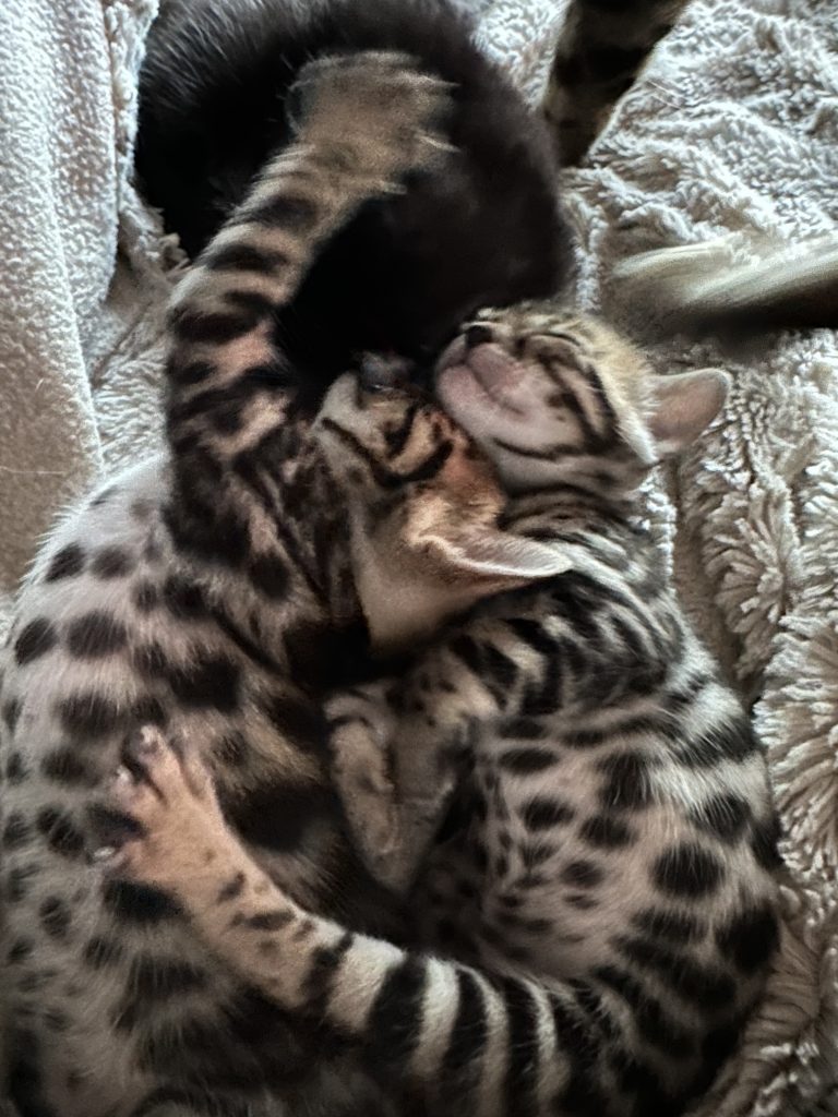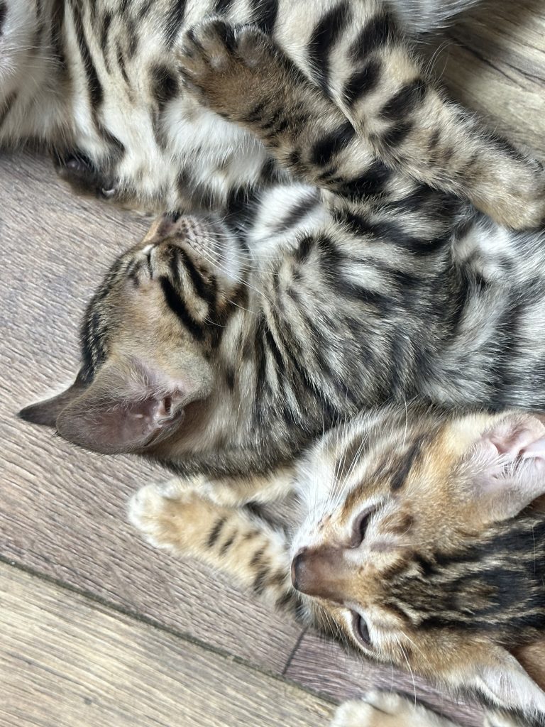 Suri ist eine Brown/Silver tabby spotted-Bengal; der Deckkater Chiko ist Brown/Black spotted tabby. Beide sind nicht nur wunderschön mit seidigem Fell, sondern haben auch einen wunderbaren Charakter. Bei den beiden war es Liebe auf den ersten Blick! Sie sind einfach zauberhaft. Beide Elterntiere hatten bereits erfolgreich Nachwuchs. Alle Kitten sind prächtig schön geworden und vor allem kerngesund!! Wir sind TICA – vereinsangehörig und selbstverständlich bekommen die Kitten Stammbäume.