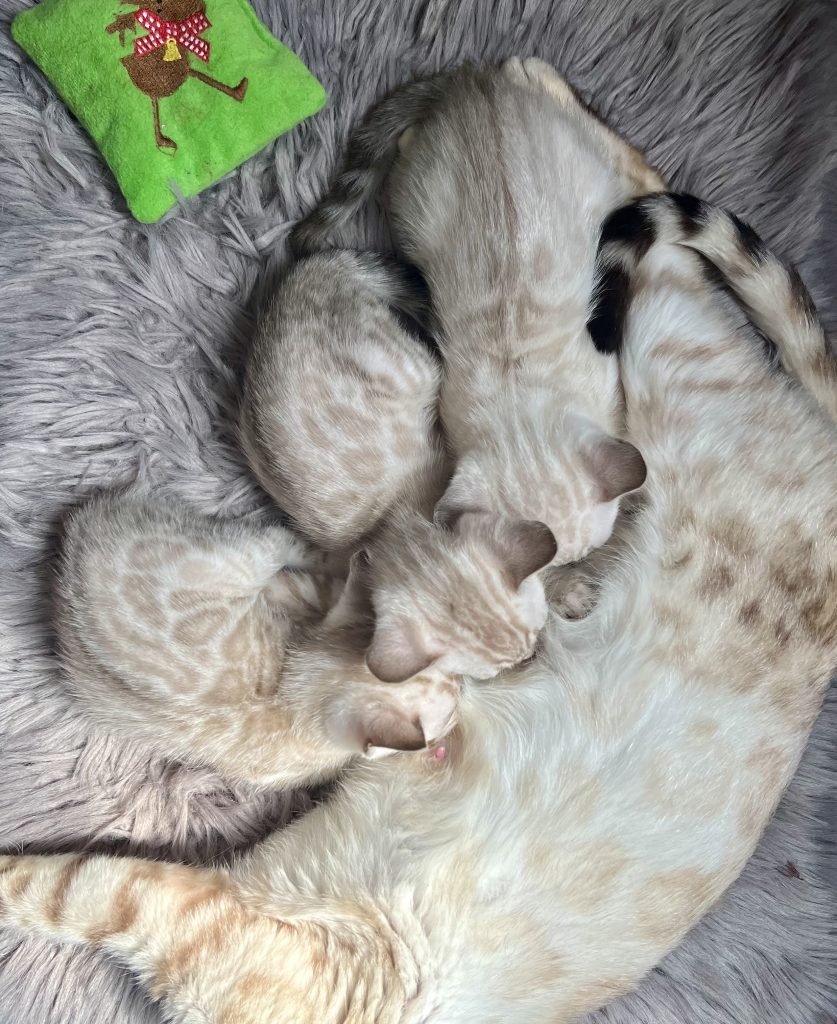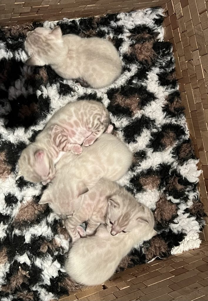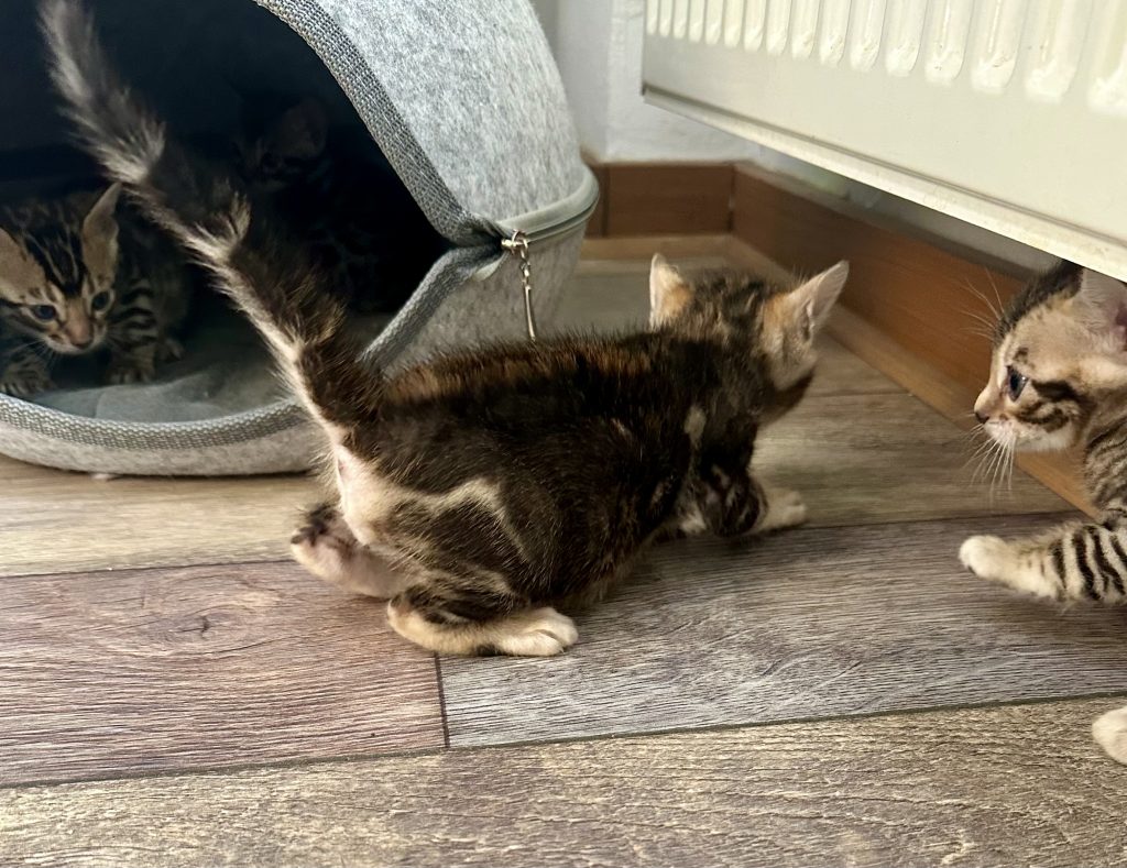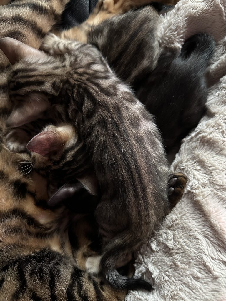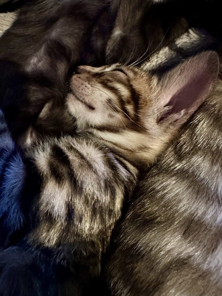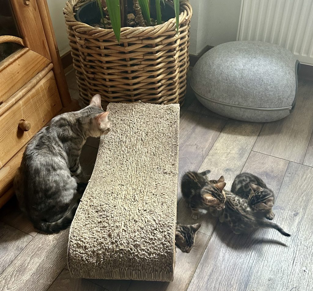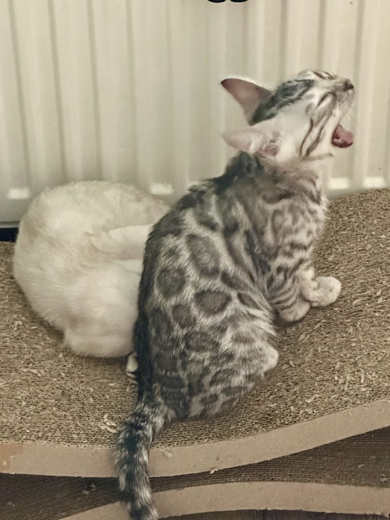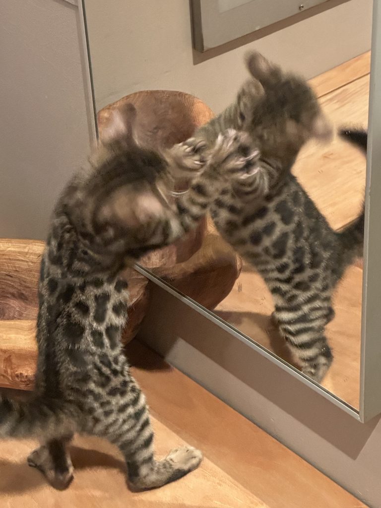 Suri ist eine Brown/Silver tabby spotted-Bengal; der Deckkater Chiko ist Brown/Black spotted tabby. Beide sind nicht nur wunderschön mit seidigem Fell, sondern haben auch einen wunderbaren Charakter. Bei den beiden war es Liebe auf den ersten Blick! Sie sind einfach zauberhaft. Beide Elterntiere hatten bereits erfolgreich Nachwuchs. Alle Kitten sind prächtig schön geworden und vor allem kerngesund!! Wir sind TICA – vereinsangehörig und selbstverständlich bekommen die Kitten Stammbäume.