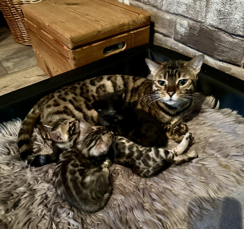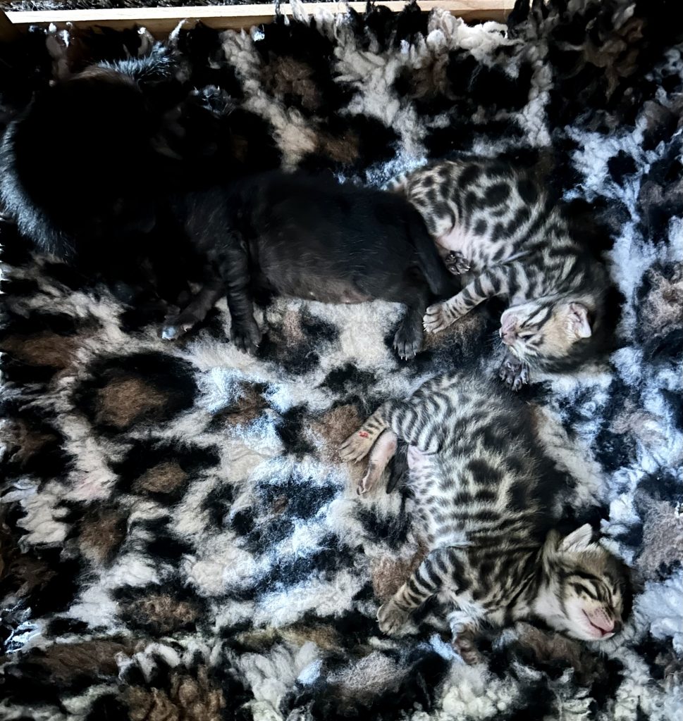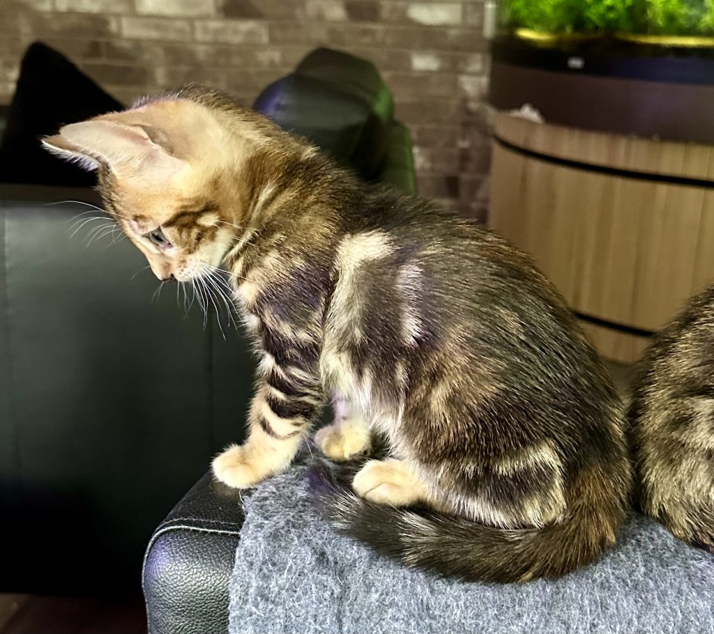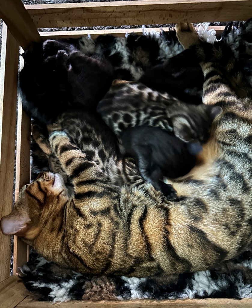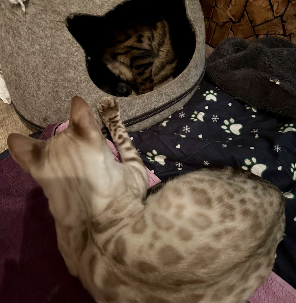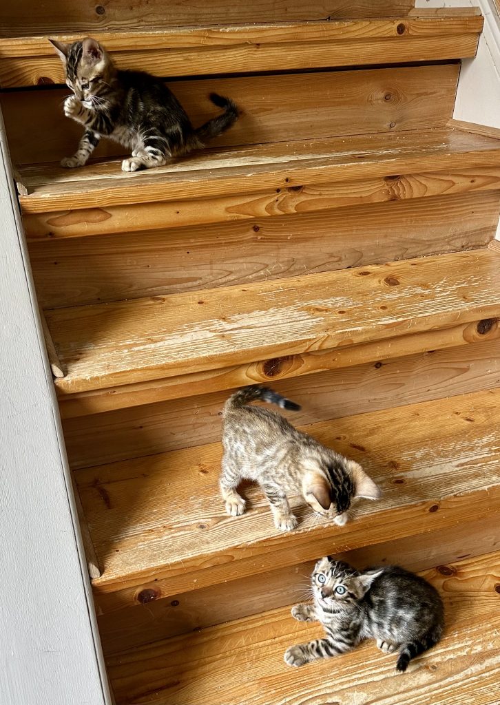Suri ist eine Brown/Silver tabby spotted-Bengal; der Deckkater Chiko ist Brown/Black spotted tabby. Beide sind nicht nur wunderschön mit seidigem Fell, sondern haben auch einen wunderbaren Charakter. Bei den beiden war es Liebe auf den ersten Blick! Sie sind einfach zauberhaft. Beide Elterntiere hatten bereits erfolgreich Nachwuchs. Alle Kitten sind prächtig schön geworden und vor allem kerngesund!! Wir sind TICA – vereinsangehörig und selbstverständlich bekommen die Kitten Stammbäume.