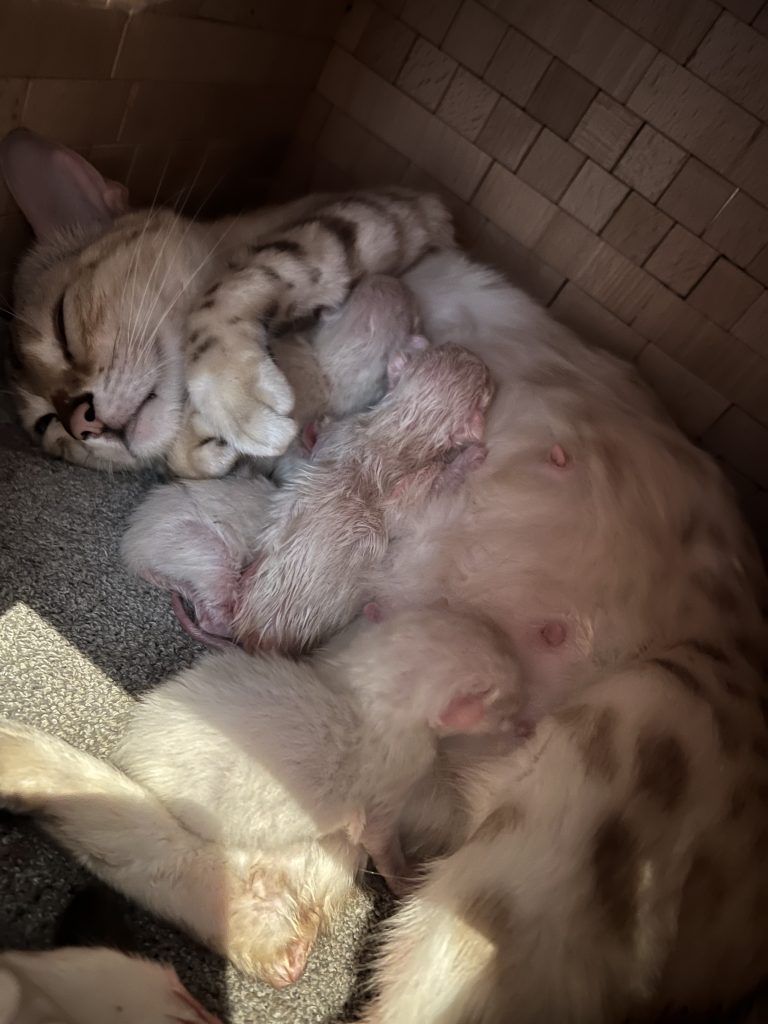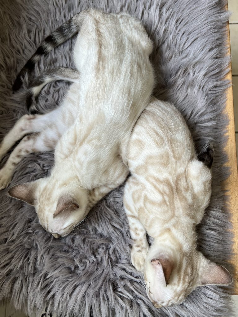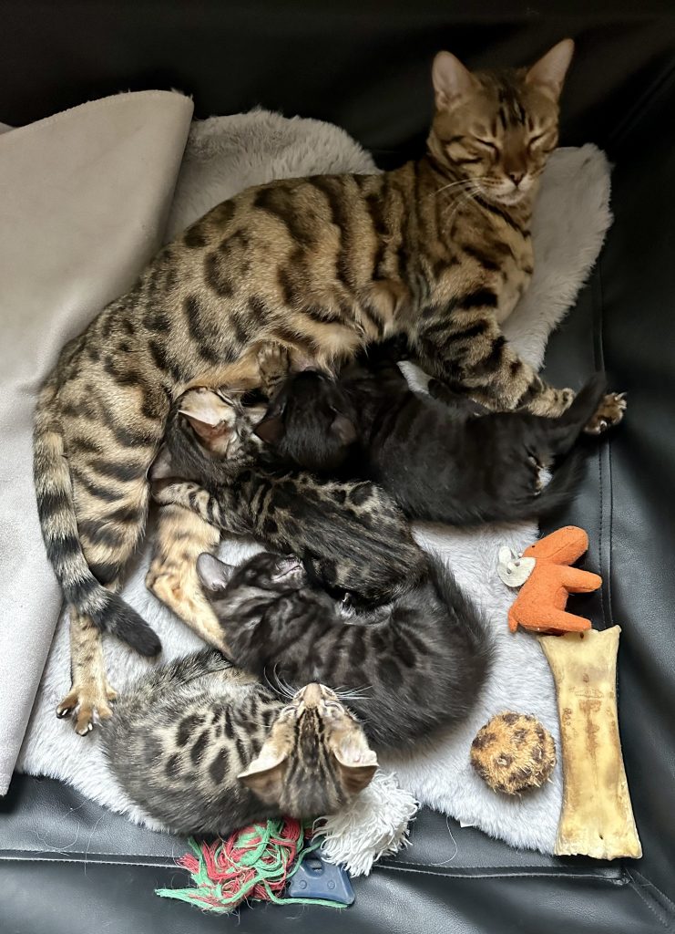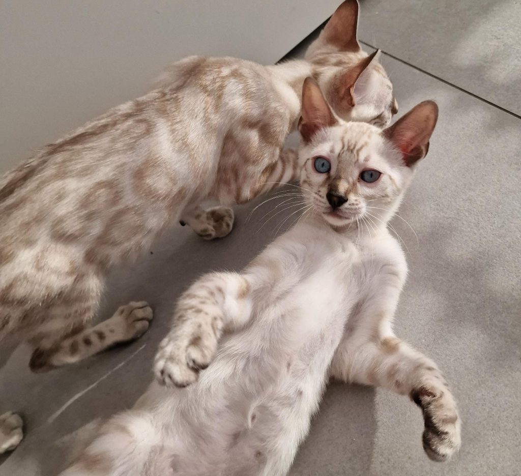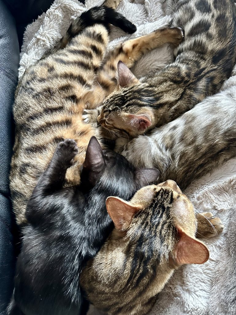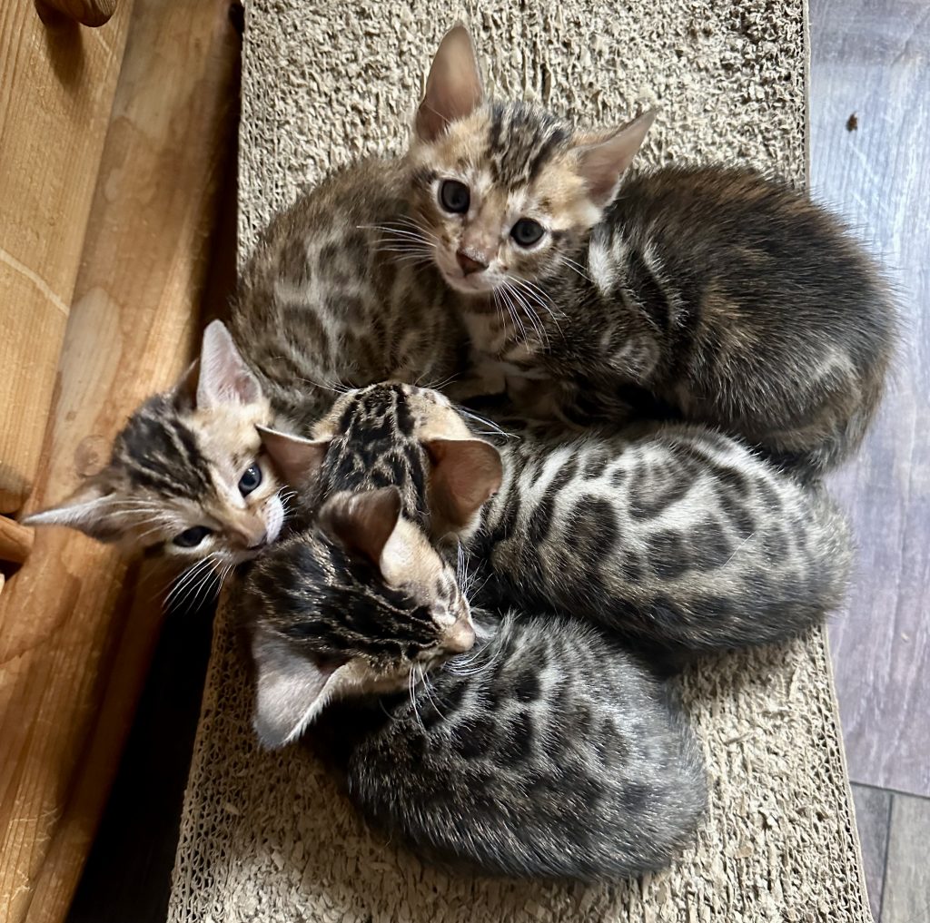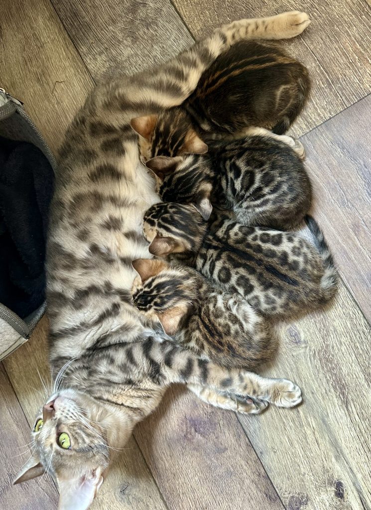 Suri ist eine Brown/Silver tabby spotted-Bengal; der Deckkater Chiko ist Brown/Black spotted tabby. Beide sind nicht nur wunderschön mit seidigem Fell, sondern haben auch einen wunderbaren Charakter. Bei den beiden war es Liebe auf den ersten Blick! Sie sind einfach zauberhaft. Beide Elterntiere hatten bereits erfolgreich Nachwuchs. Alle Kitten sind prächtig schön geworden und vor allem kerngesund!! Wir sind TICA – vereinsangehörig und selbstverständlich bekommen die Kitten Stammbäume.
