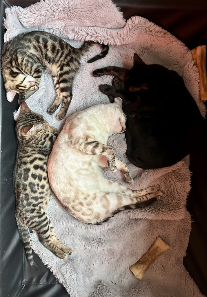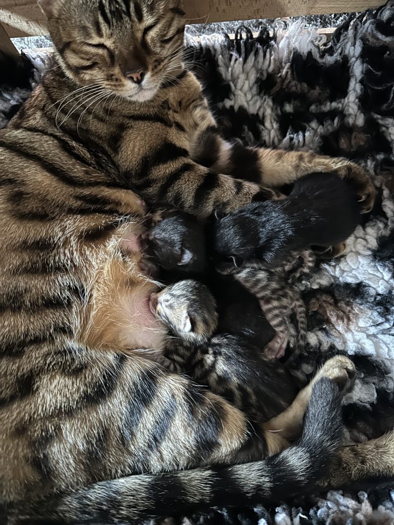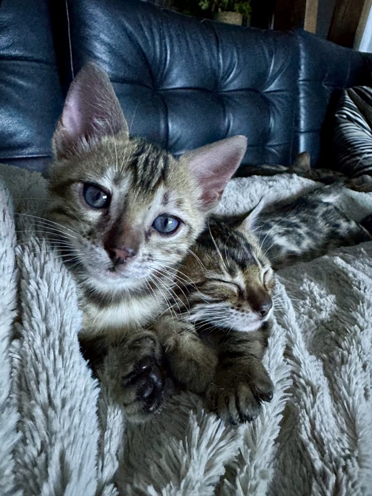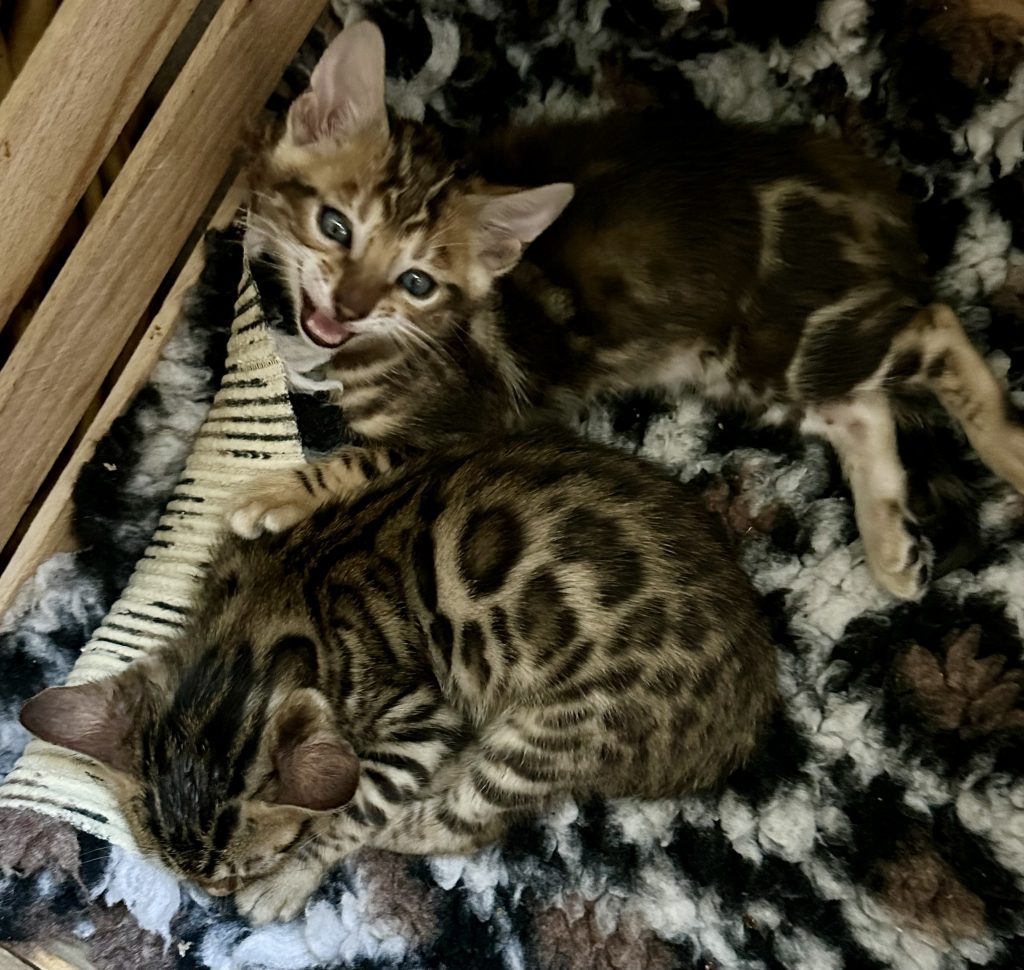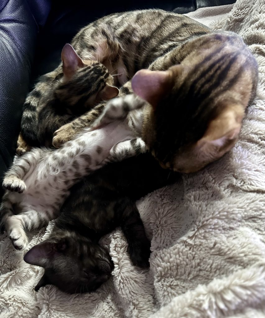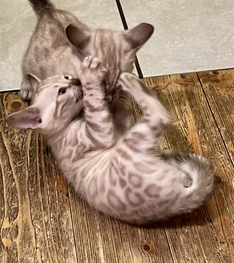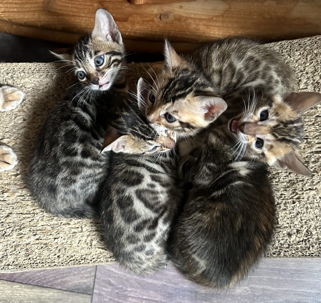 Suri ist eine Brown/Silver tabby spotted-Bengal; der Deckkater Chiko ist Brown/Black spotted tabby. Beide sind nicht nur wunderschön mit seidigem Fell, sondern haben auch einen wunderbaren Charakter. Bei den beiden war es Liebe auf den ersten Blick! Sie sind einfach zauberhaft. Beide Elterntiere hatten bereits erfolgreich Nachwuchs. Alle Kitten sind prächtig schön geworden und vor allem kerngesund!! Wir sind TICA – vereinsangehörig und selbstverständlich bekommen die Kitten Stammbäume.