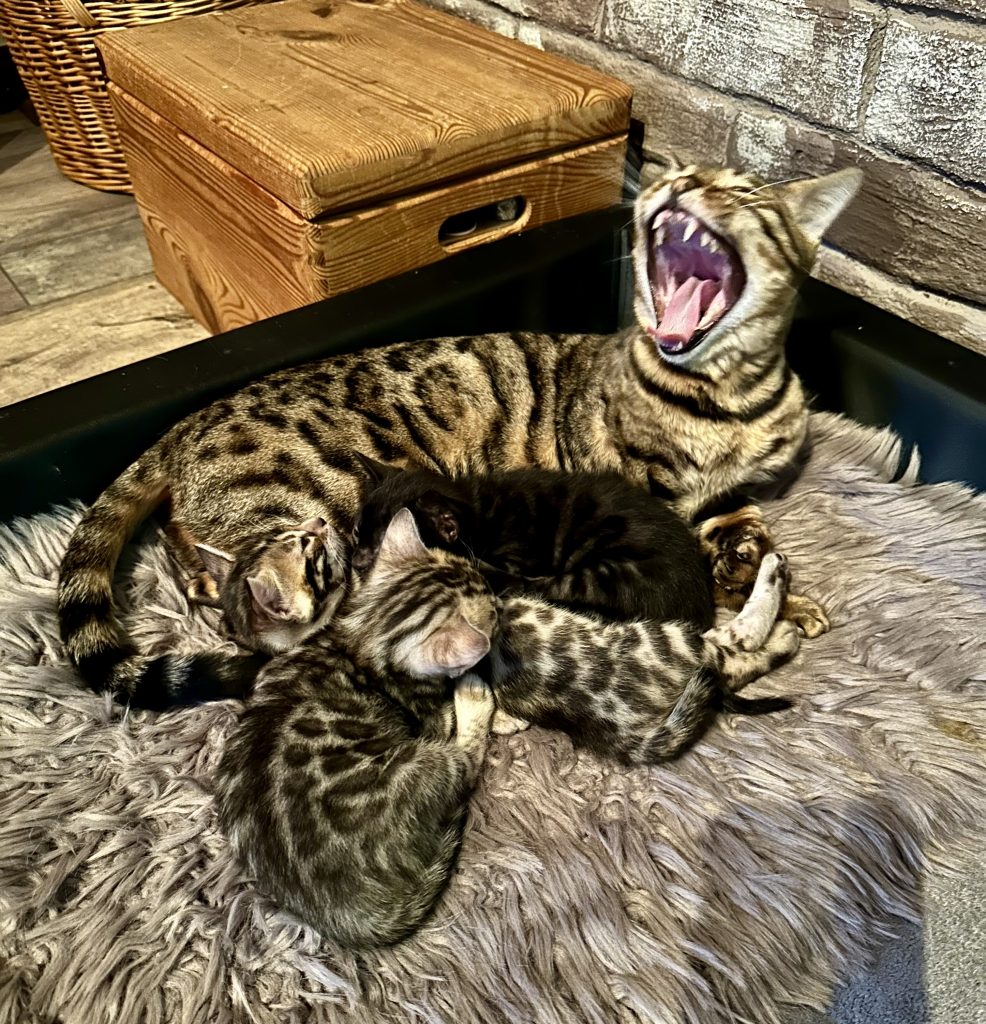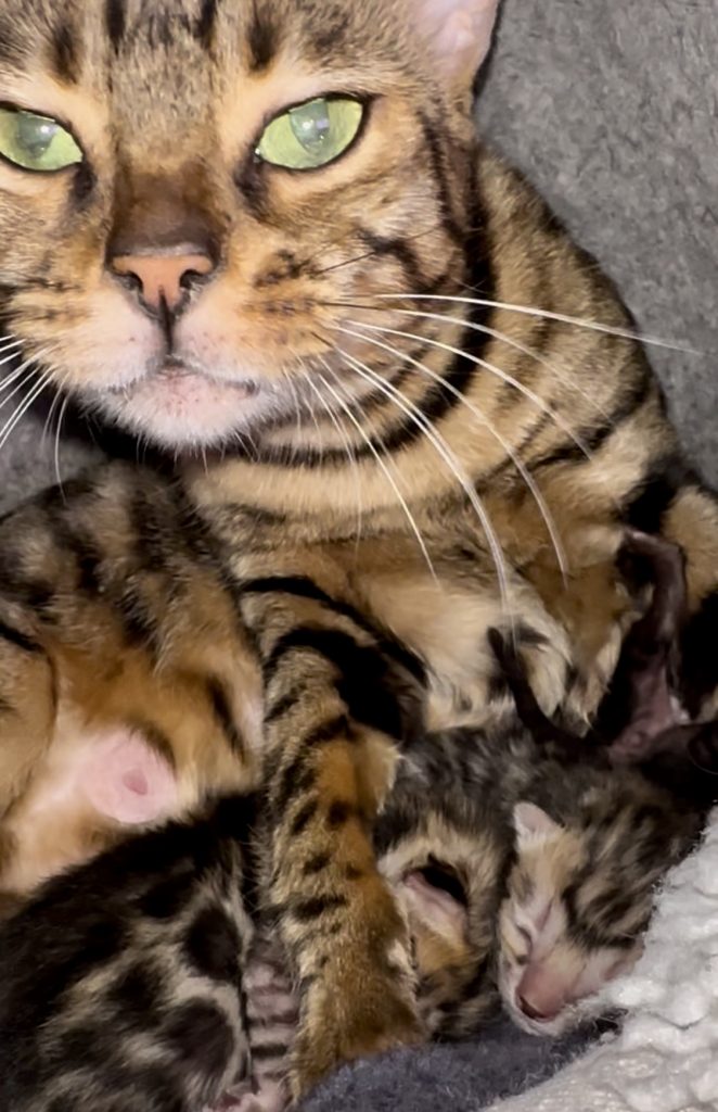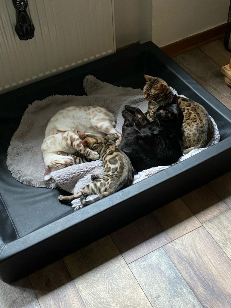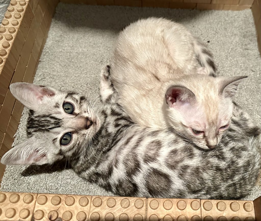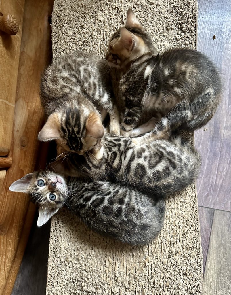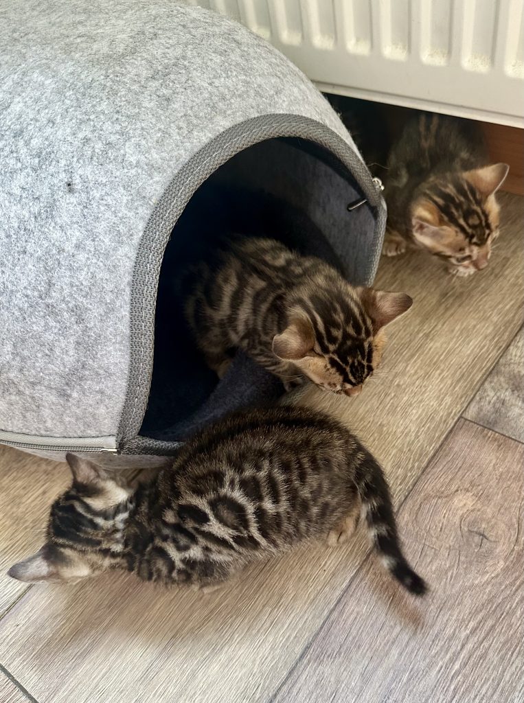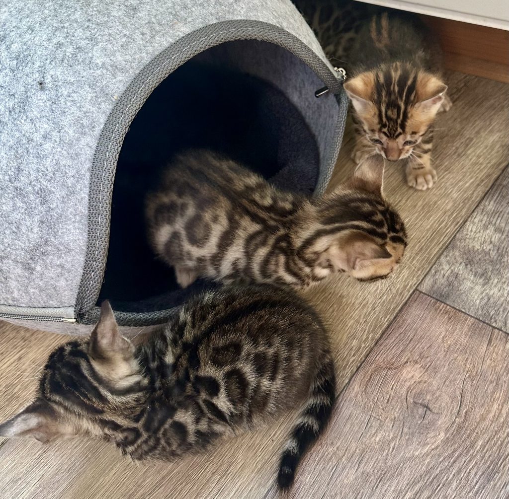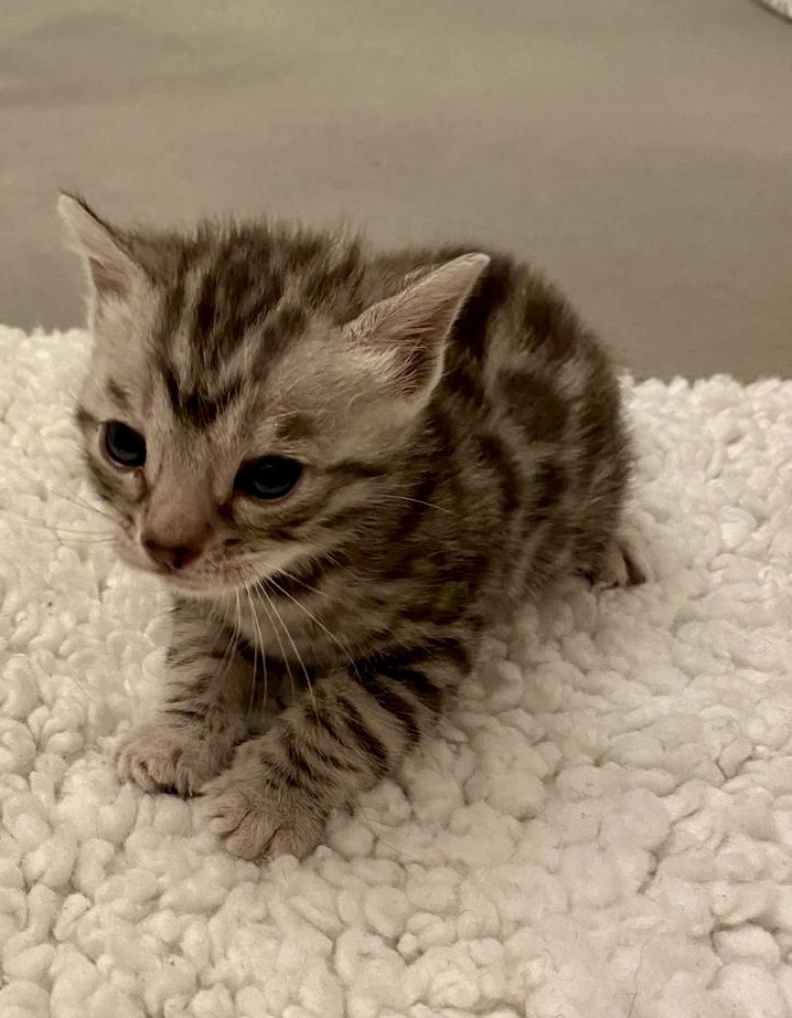 Suri ist eine Brown/Silver tabby spotted-Bengal; der Deckkater Chiko ist Brown/Black spotted tabby. Beide sind nicht nur wunderschön mit seidigem Fell, sondern haben auch einen wunderbaren Charakter. Bei den beiden war es Liebe auf den ersten Blick! Sie sind einfach zauberhaft. Beide Elterntiere hatten bereits erfolgreich Nachwuchs. Alle Kitten sind prächtig schön geworden und vor allem kerngesund!! Wir sind TICA – vereinsangehörig und selbstverständlich bekommen die Kitten Stammbäume.